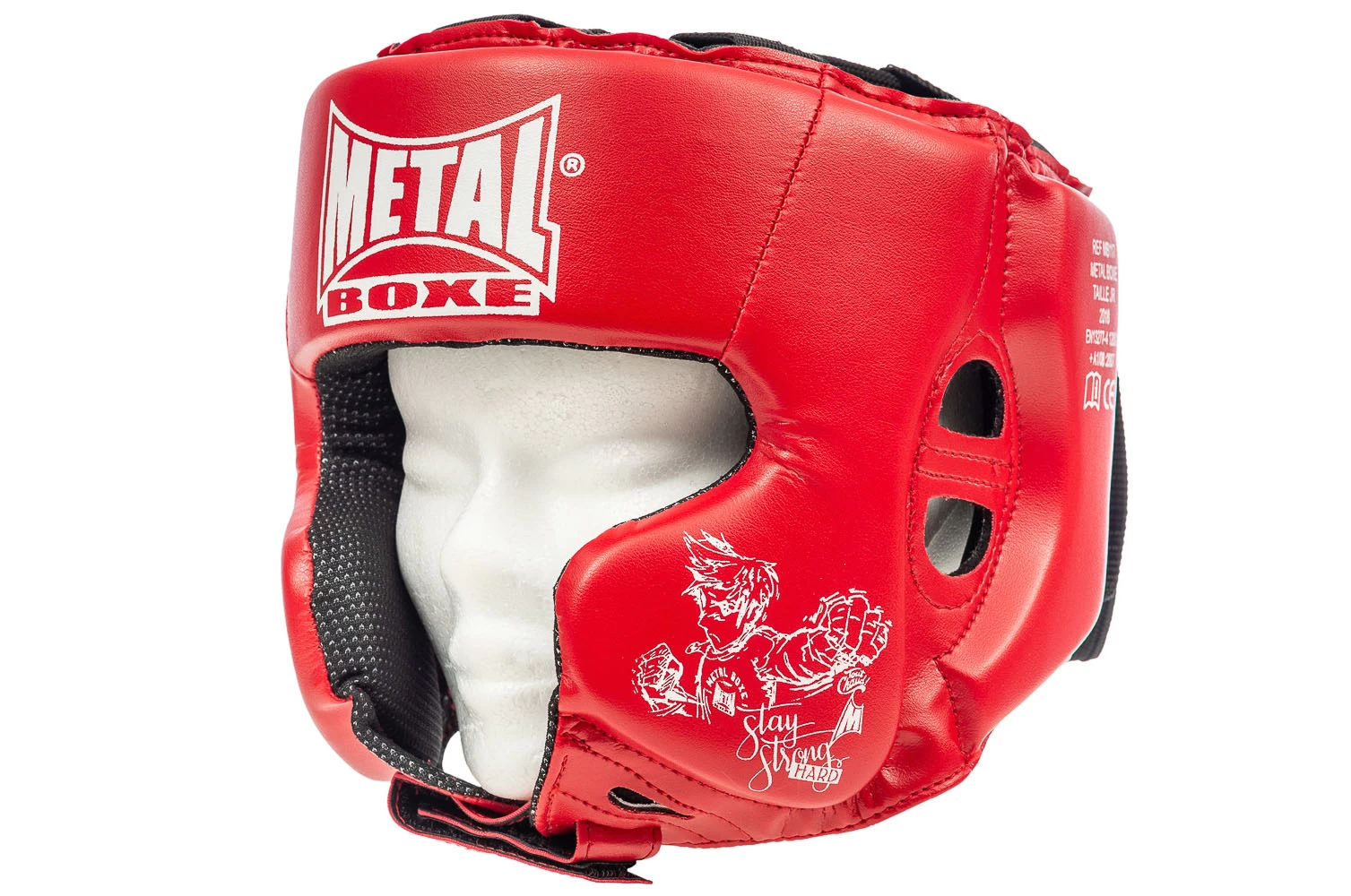 Modèle avec protège pommettes. Enveloppe PU, intérieur PVC. Rembourrage mousse POLYOIL + PPG = EVA. Protections de tympans. Serrage dessus de tête par laçage, serrage arrière et menton par velcros. Mise en place très rapide, excellent maintien, léger et confortable. Entretien facile (vaselinez régulièrement les coutures, passez à l’intérieur un chiffon légèrement humide après chaque entraînement). A n’en pas douter le casque des écoles de boxe.